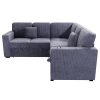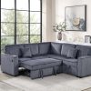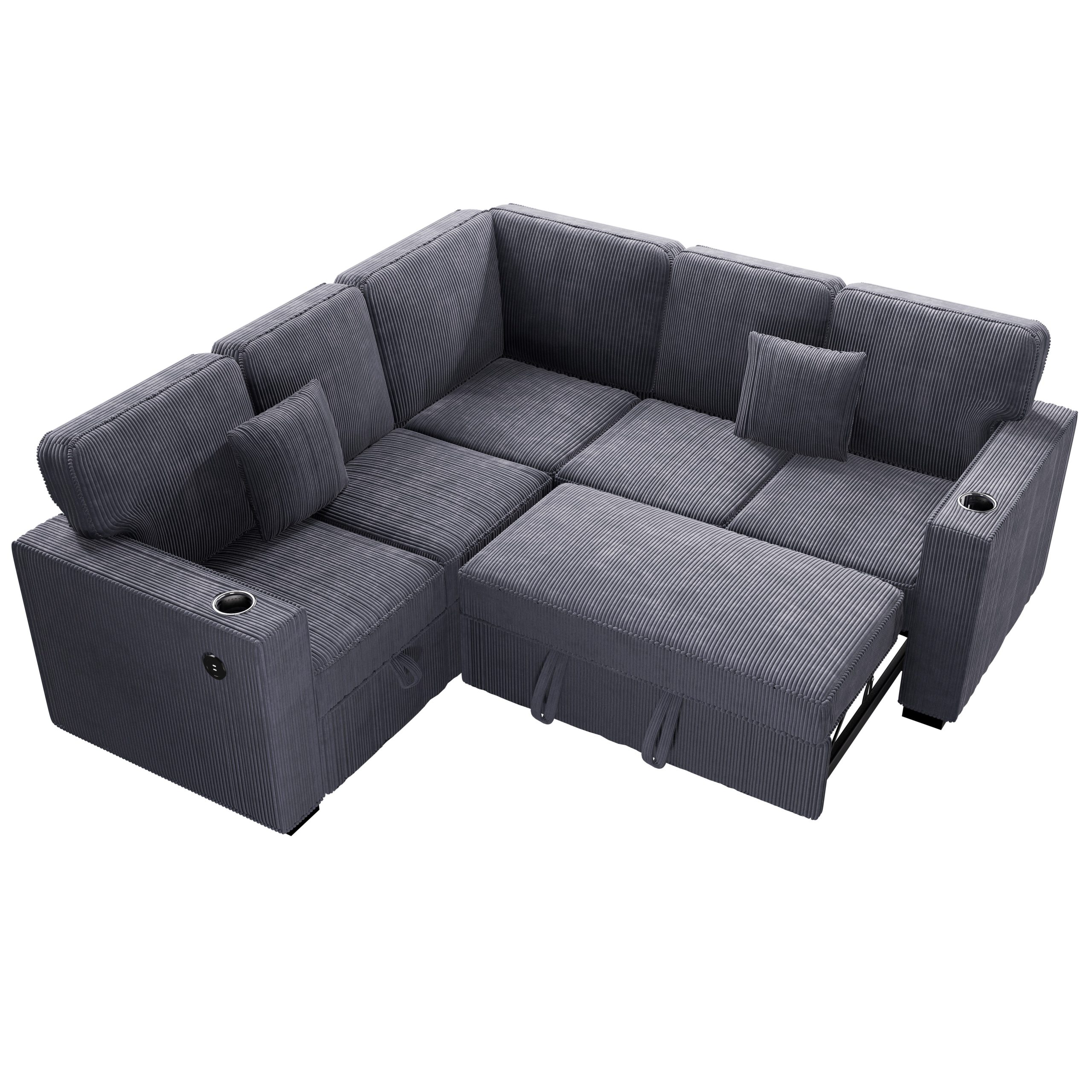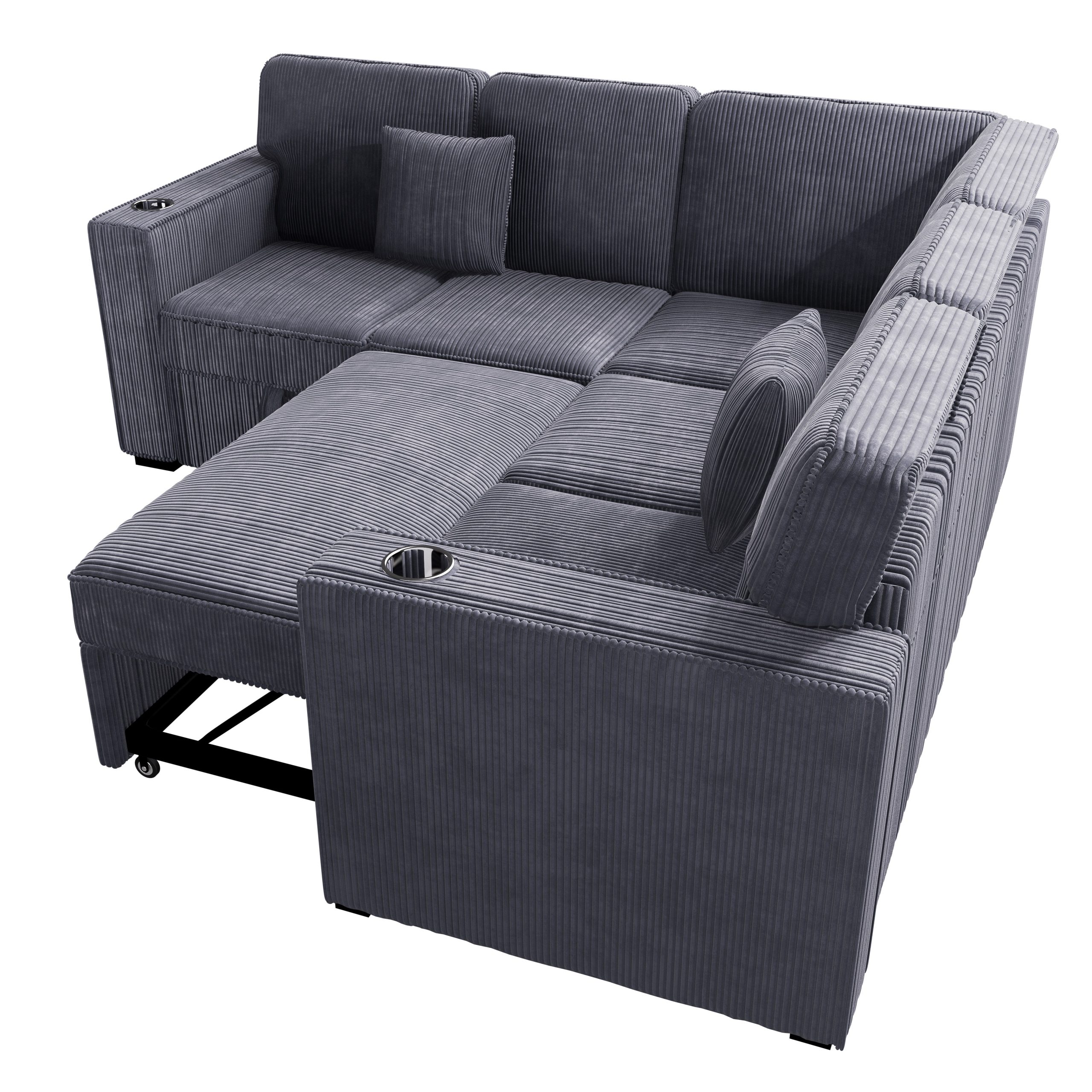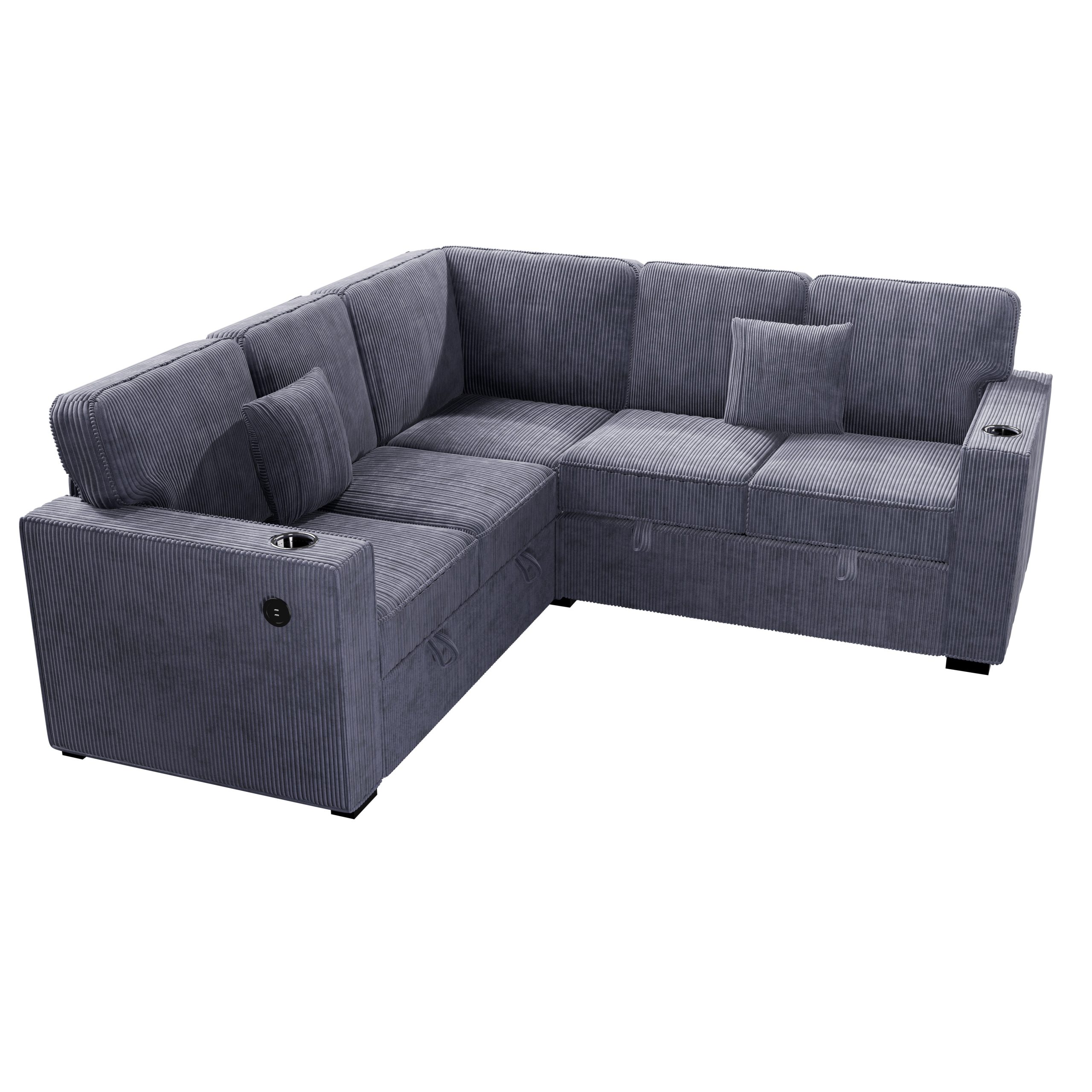this multifunctional L-shaped sectional that brings comfort, style, and practicality into one piece. This sleek design features a convenient pull-out bed, making it ideal for hosting overnight guests. The sectional includes a storage sofa, perfect for keeping blankets, pillows, or other essentials within easy reach, maintaining an organized and clutter-free environment. Both arms are equipped with built-in cup holders, ensuring your drinks stay secure, while one arm also boasts a handy USB port for effortless device charging. The two matching accent pillows add a touch of coordination to the overall look, while the low-profile legs give the sectional a modern, grounded appeal that complements contemporary décor. Comfortably seating up to four people, this sectional is the ideal centerpiece for any living room.  Color: Dark Gray; Material: Corduroy