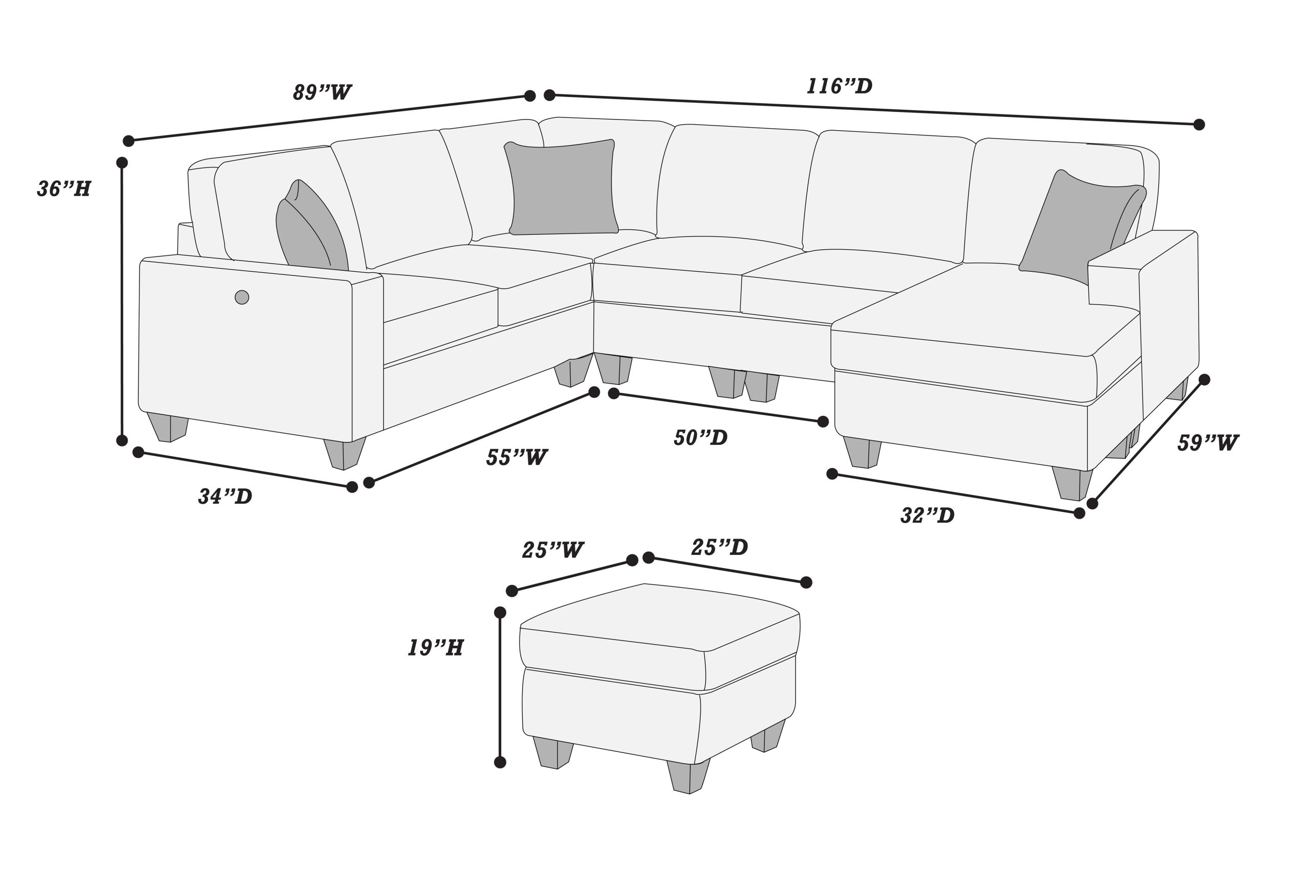 - LAF Loveseat: 55″ x 34″ x 36″ H; RAF Loveseat W/ Chaise: 55″ x 59″ x 36″ H; Corner Wedge: 34″ x 34″ x 36″ H; Armless Chair: 25″ x 34″ x 36″ H; Ottoman: 25″ x 25″ x 19″ H