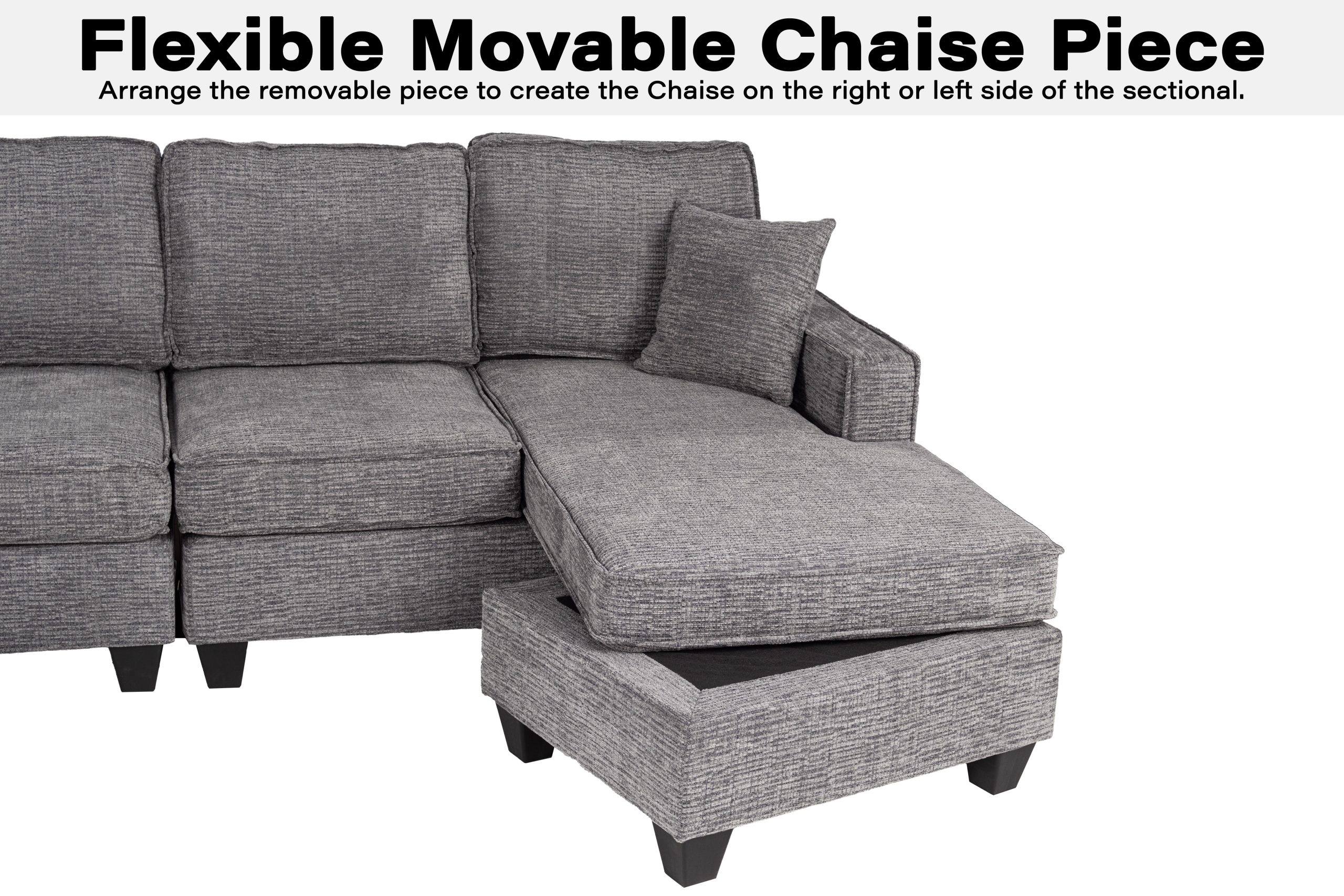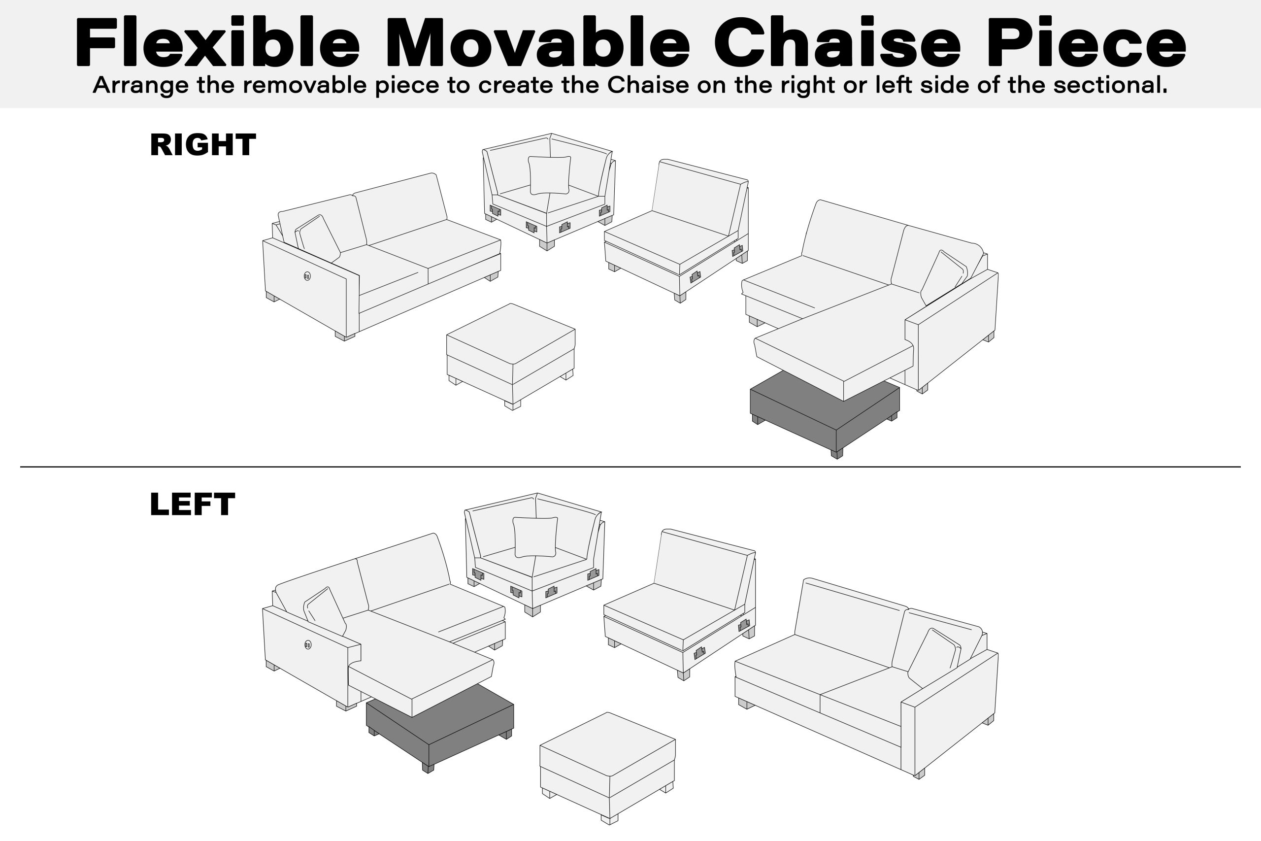 - A versatile ottoman piece gives you the freedom to create a chaise on either side of the sectional, making it easy to adjust the layout to your comfort.